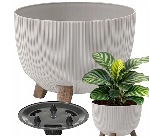 Ghiveciul ROMA JUMPER de la Lamela se remarcă printr-un design modern, o formă rotunjită și un model subtil striat pe suprafață. Culoarea sa naturală, combinată cu picioarele de aspect lemn, oferă întregului ansamblu un caracter minimalist și elegant.